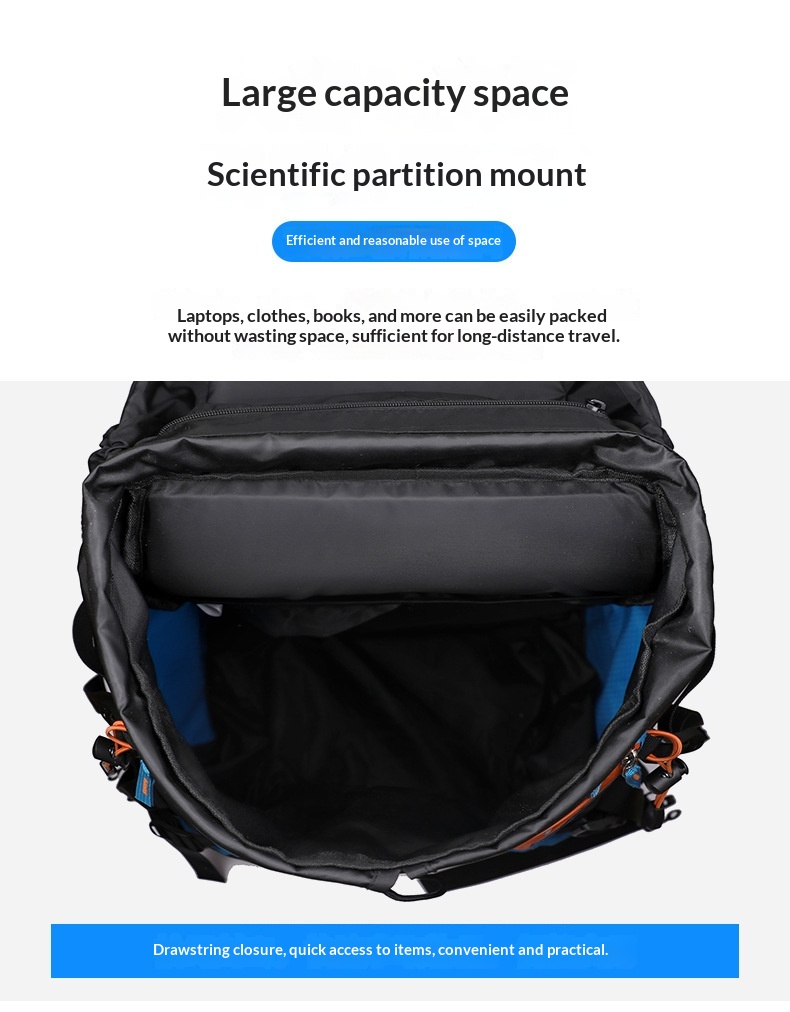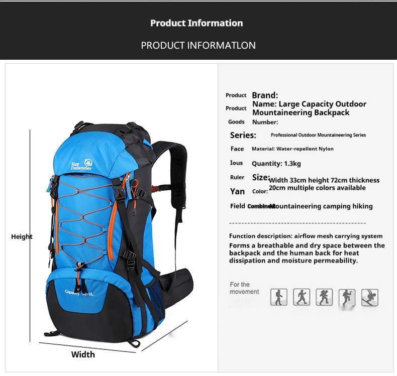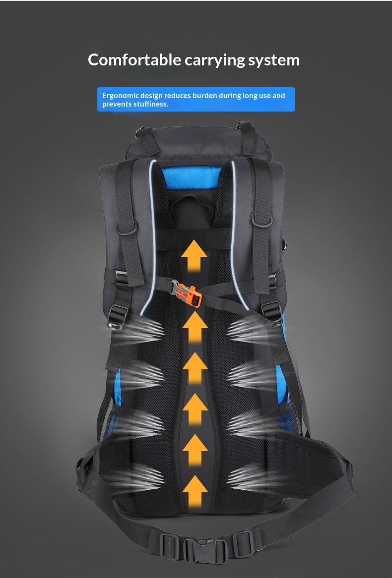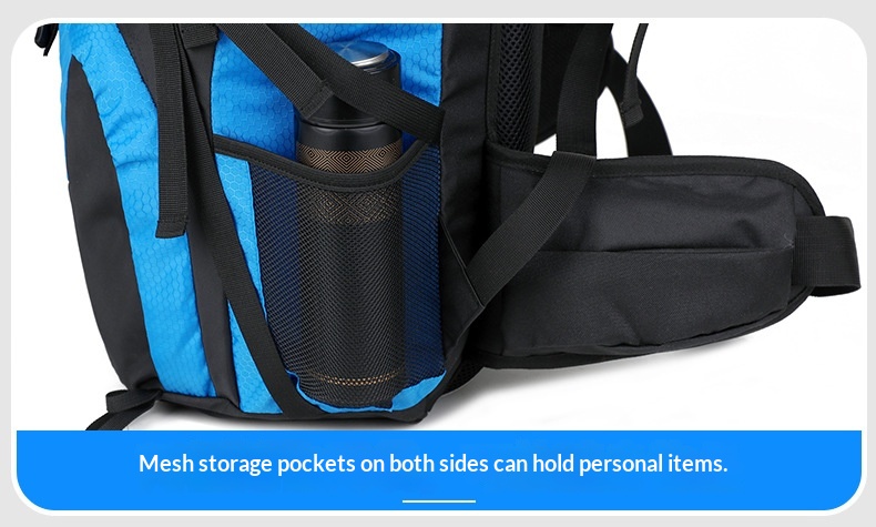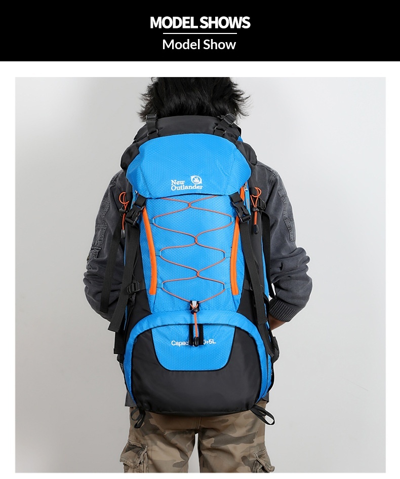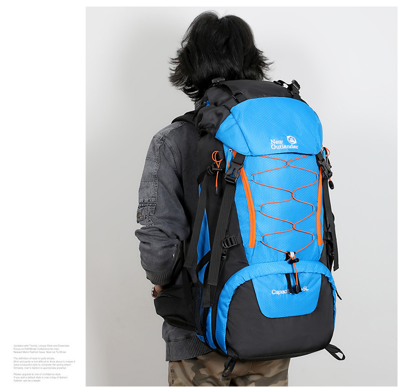 Product information: Pattern: Solid color Lining Material: Polyester Suitable Sports: Mountain climbing, hiking, camping Applicable Scenarios: Outdoor activities Colors: Black, gray, sky blue, navy blue Applicable Gender: Unisex / Suitable for both men and women Features: Waterproof, load reduction Material: Polyester Carrying System: Ergonomic back panel Style: Casual travel Capacity: 65L