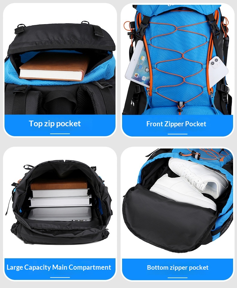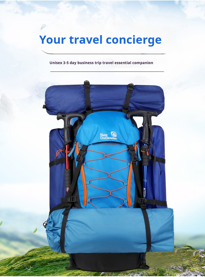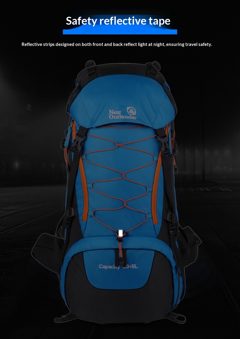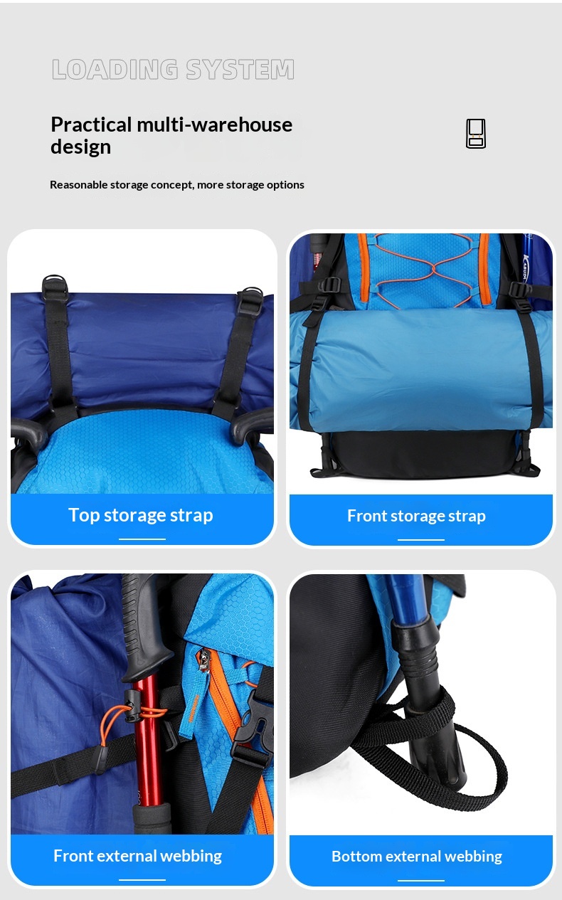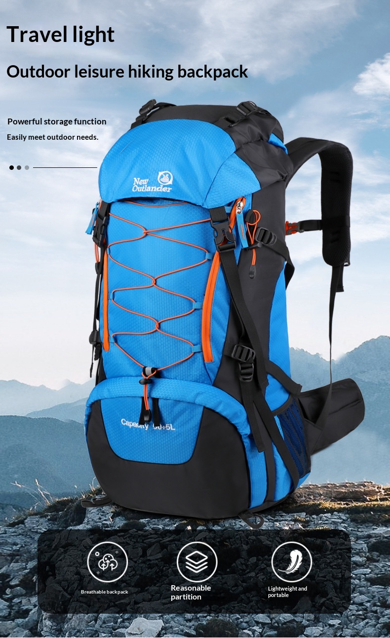 Product information: Pattern: Solid color Lining Material: Polyester Suitable Sports: Mountain climbing, hiking, camping Applicable Scenarios: Outdoor activities Colors: Black, gray, sky blue, navy blue Applicable Gender: Unisex / Suitable for both men and women Features: Waterproof, load reduction Material: Polyester Carrying System: Ergonomic back panel Style: Casual travel Capacity: 65L